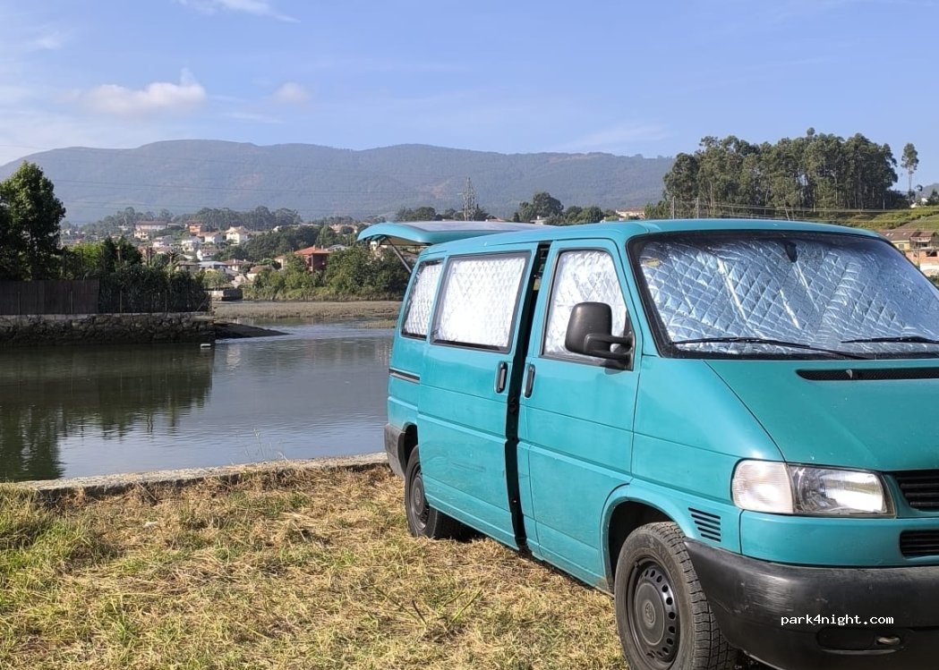 1 / 4Parking accessible, plat et en terre battue, avec vue sur l'estuaire. On peut y séjourner de jour comme de nuit. La route est à proximité, mais la circulation est quasi inexistante la nuit. Aucun service n'est disponible.