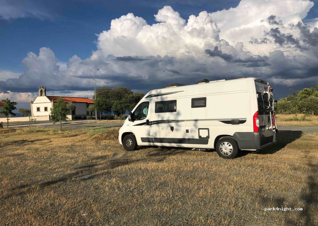 Parking de la chapelle Sanctuario de nossa Senhora da cabeca. Vue 360. Grand stationnement plat gravillonné et gazonné. Des passages très rares