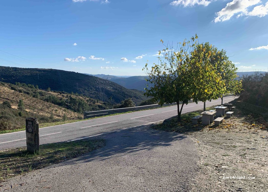 1 / 3P avec 3 tables de pique-nique avec ombre et source d'eau permanente NON contrôlée, avec 2 grands arbres à côté de la route EN 222. Point de vue.