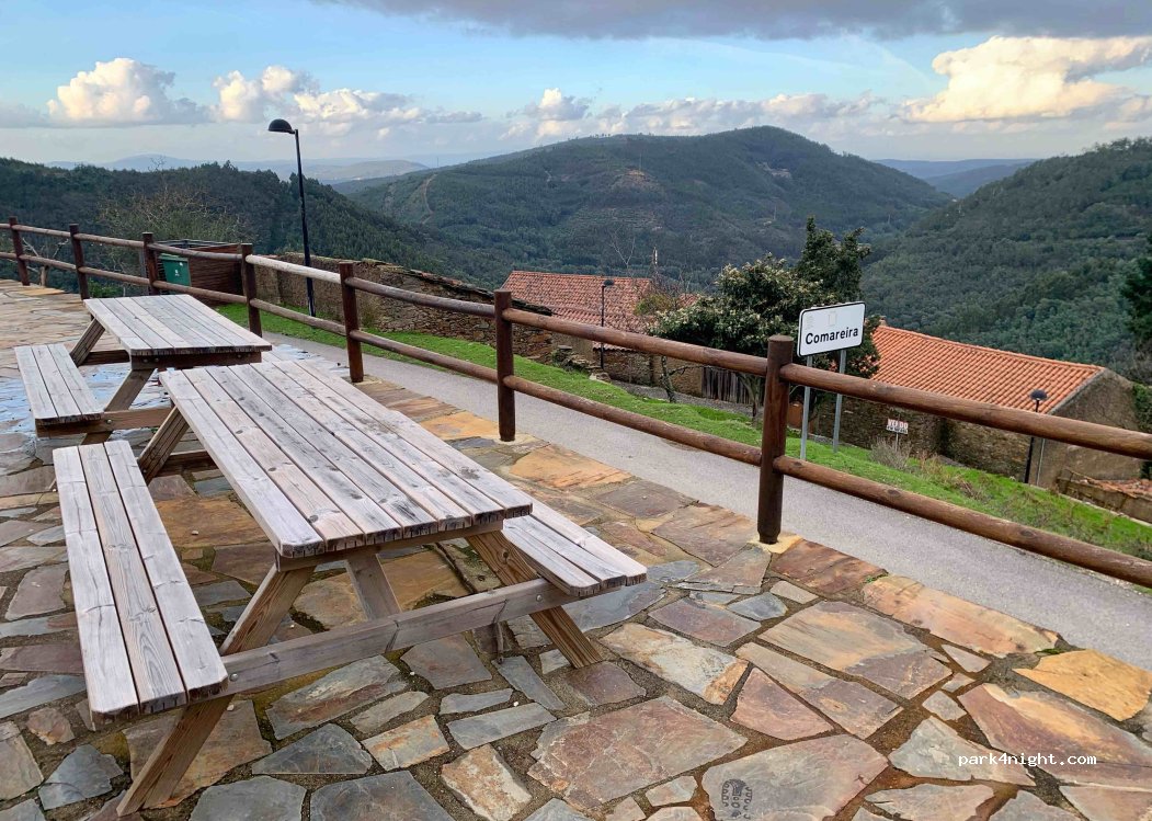1 / 5Grill avec 2 tables de pique-nique en bois avec vue sur les collines et juste au-dessus du plus petit village de schiste, COMAREIRA, avec panneau d'information jaune en portugais + anglais, à 550 m d'altitude. Eau non contrôlée à côté des tables (robinet bleu ouvert sur le côté droit). Accès par une route de montagne étroite mais bien asphaltée sur 4 km depuis la route EN 342, plus étroite sur les 500 premiers mètres après l'EN 342. Plat et éclairé