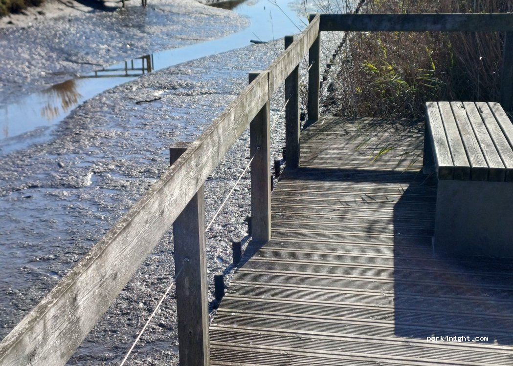 Petite terrasse sur pilotis au milieu des roseaux.