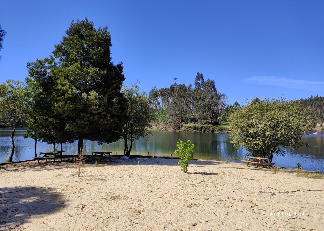 1 / 2Parking d'une plage aménagée en sable au bord du petit lac, avec tables de pic-nic. Le parking est un peu en pente. Accessible par une petite route goudronnée. Super calme et ombragé le matin.