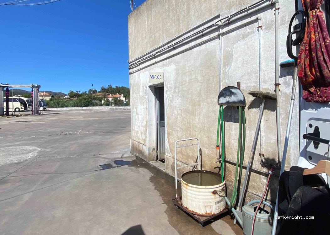 1 / 2Robinet de réservoir d'eau (probablement pas d'eau potable) avec raccordement Gardena disponible et toilettes sur une grande place avec station-service et parking pour bus disponibles.