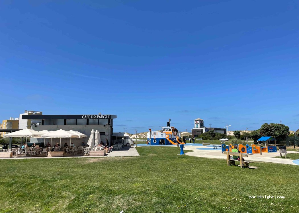 1 / 4Parking à côté d'une grande aire de jeux, d'une aire de pique-nique et du « Café do Parque ». Super pour passer un après-midi en famille. Toilettes au café. La rue semble plutôt calme. Vues sur le port. Plage pas très loin de l'autre côté du parc. Je n'ai pas dormi ici mais il n'y a aucun panneau interdisant de passer la nuit. Petit distributeur d'eau sur l'aire de jeux, mais rien pour remplir votre réservoir. Des camping-cars plus gros pourraient éventuellement se garer le long de la clôture.