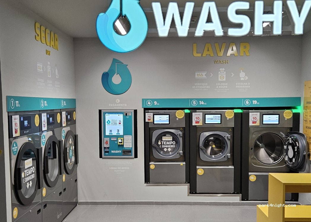 Laverie libre-service dans le parking souterrain du marché Continente. Vous pouvez vous garer dans le parking souterrain situé au-dessus.