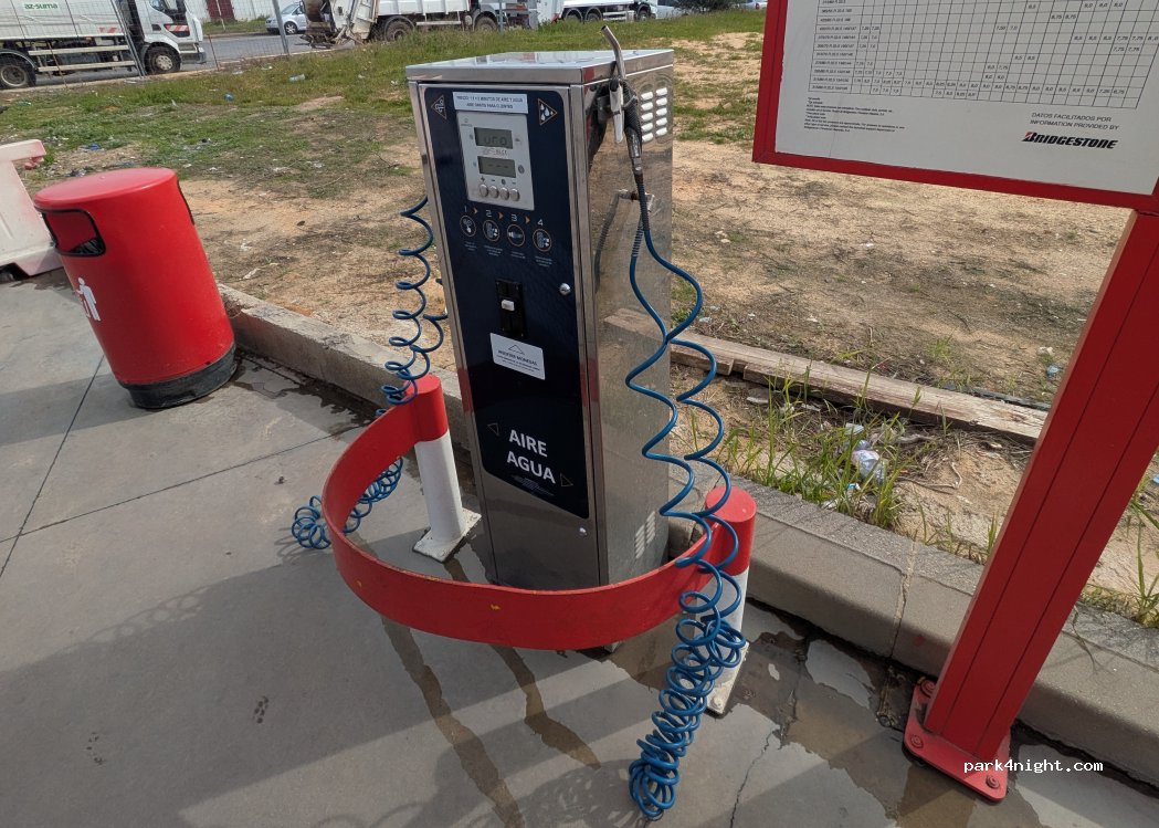 Station service CEPSA. Air/eau pour 1€/5 min. Nous avons rempli environ 50-60l en 5 min. Attention l'eau est avec une poignée "pompe", vous vous fatiguerez :) Je ne promets pas que l'eau est potable cependant. Nous ne la boirons pas. Il y a également une station de lavage d'animaux en libre-service et une station de lavage de voiture en libre-service (sans toit, donc pas de limite de hauteur) sur place.