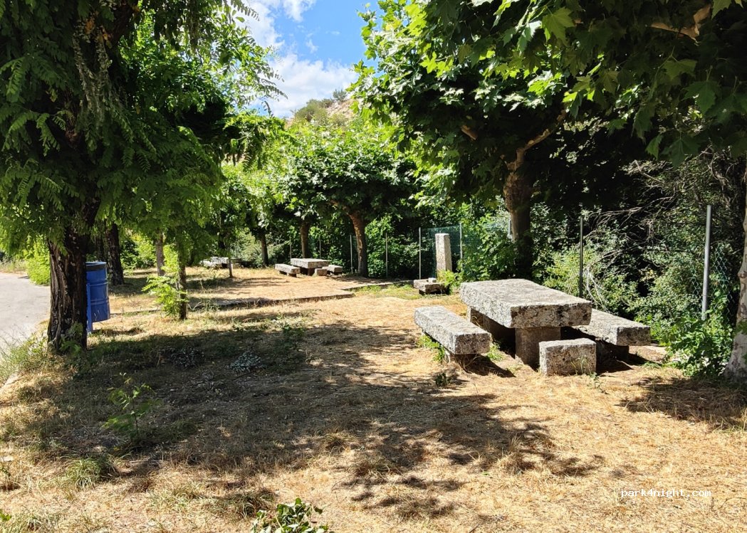 1 / 2Petite aire de repos, en pente. Avec de l'ombre, des tables en pierre et une fontaine (sans garantie sanitaire). Pour plusieurs véhicules (8 voitures).