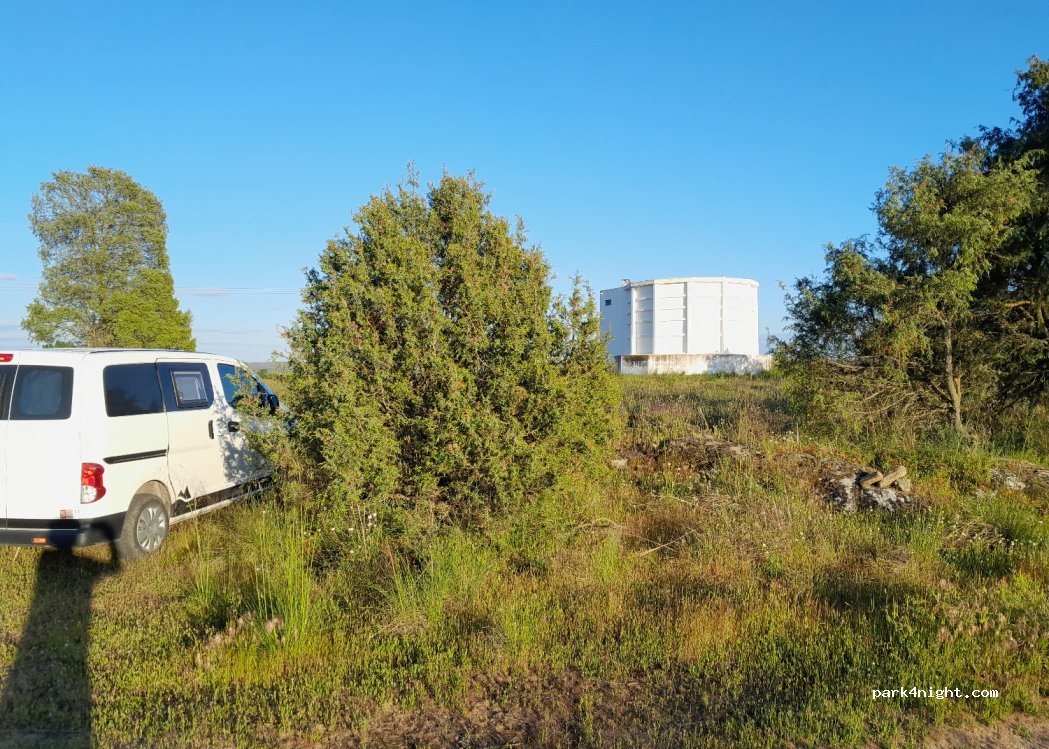 1 / 2A trente mètres derrière le château d'eau, sur le point le plus élevé de la région et avec une belle et large vue panoramique. Quelques grands buissons offrent de l'ombre et, quelques centaines de mètres plus au sud, un réseau de sentiers de randonnée balisés mène également au parc national, qui commence de l'autre côté de la route. Depuis cette route, on peut accéder au point par deux chemins de gravier légèrement délavés en direction du château d'eau. Même les camping-cars de taille moyenne ne devraient avoir aucun problème à utiliser l'approche sud.