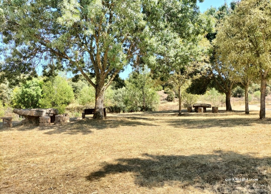 1 / 32 tables à pique nique en pierre au bord d'une rivière. Petite chapelle au dessus.