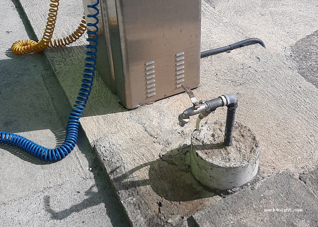 1 / 2Robinet d'eau à côté de la pompe de gonflage des pneus, filetage large. La station de lavage, à hauteur illimitée, est située à gauche de la station.