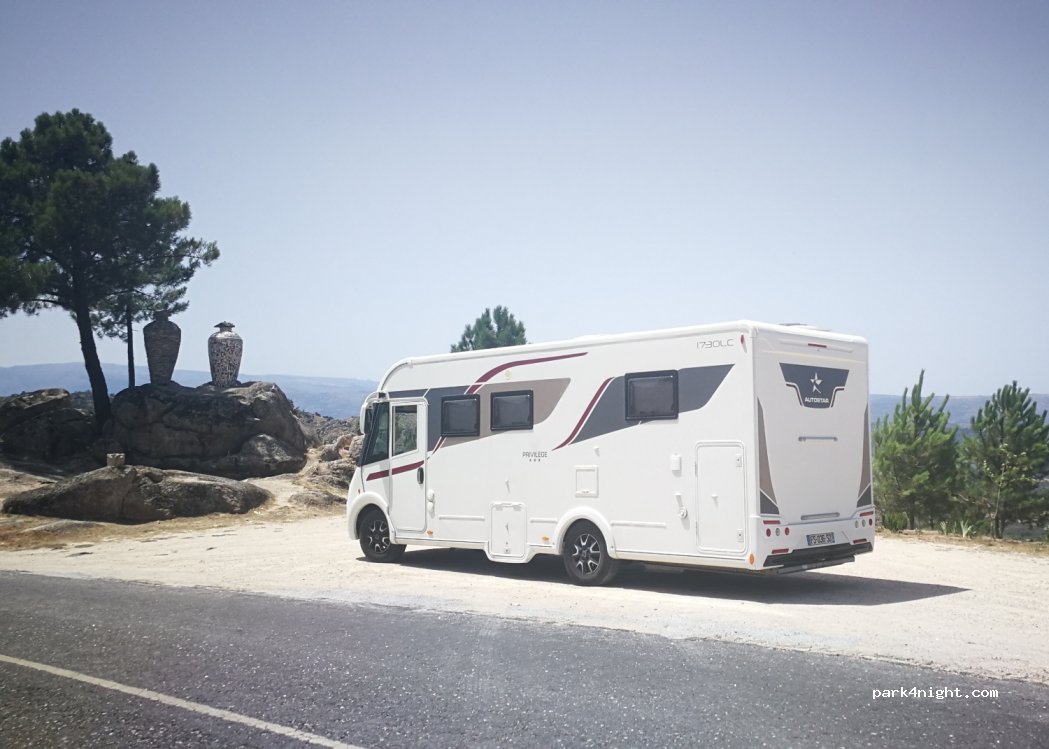 1 / 4Parking de bord de route en terre. Légèrement en pente. Proche village fortifié de Sortelha. Eau disponible à la fontaine sculptée . Exposition de jarres. Vue magnifique sur la vallée. Route peu passante tant de jour que de nuit.