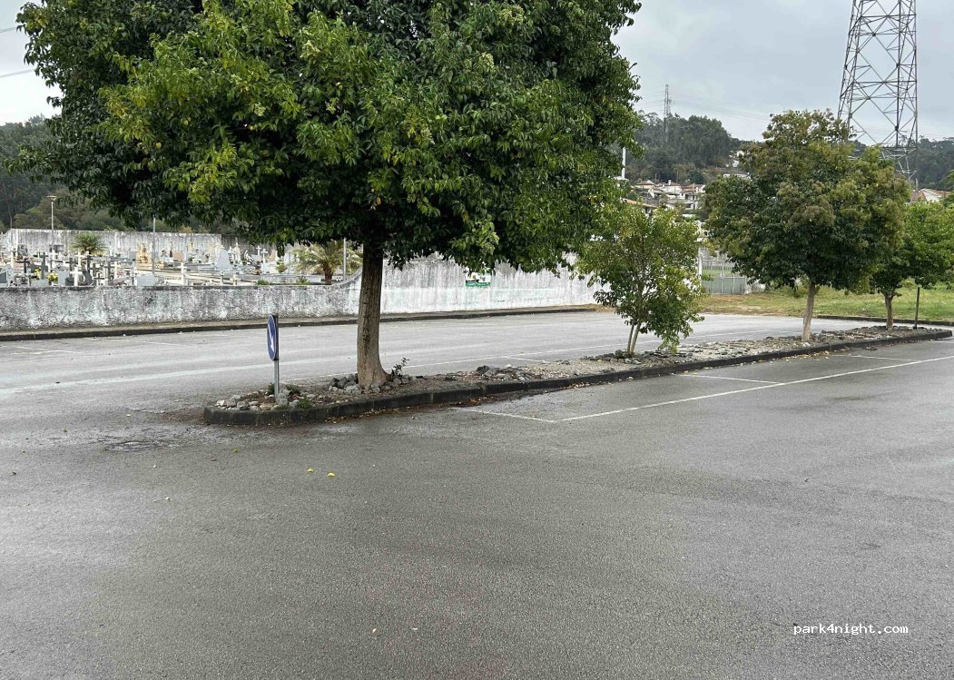 1 / 2Parking d'une église avec cimetière. Plusieurs places de stationnement sont disponibles, notamment le long d'un îlot arboré.