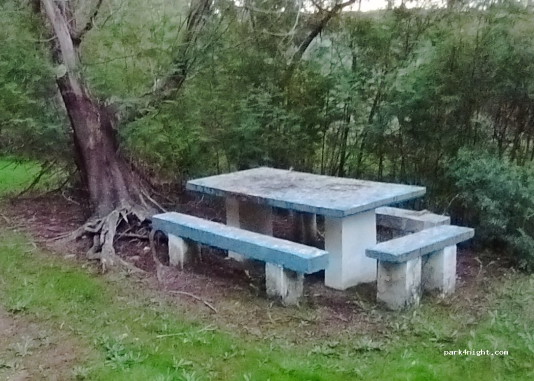 Plusieurs tables de pique-nique bordent un chemin de terre, facilement accessible en voiture. Aucun service. Le murmure d'un ruisseau accompagne le tout.