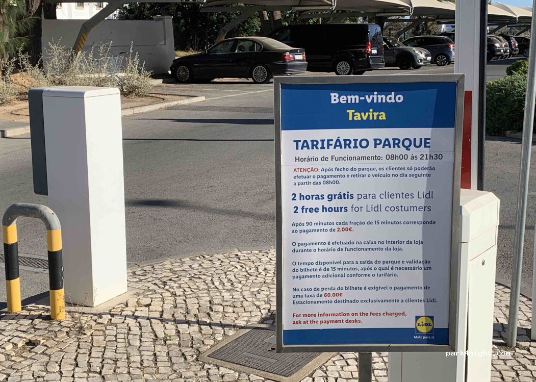 1 / 2Supermarché LIDL P à Tavira, près de la gare. Parking fermé (probablement fermé entre 21h30 et 8h00). Quelques places non couvertes à 2,60 m. Panneau d'information indiquant la gratuité du parking jusqu'à 2 h d'utilisation.